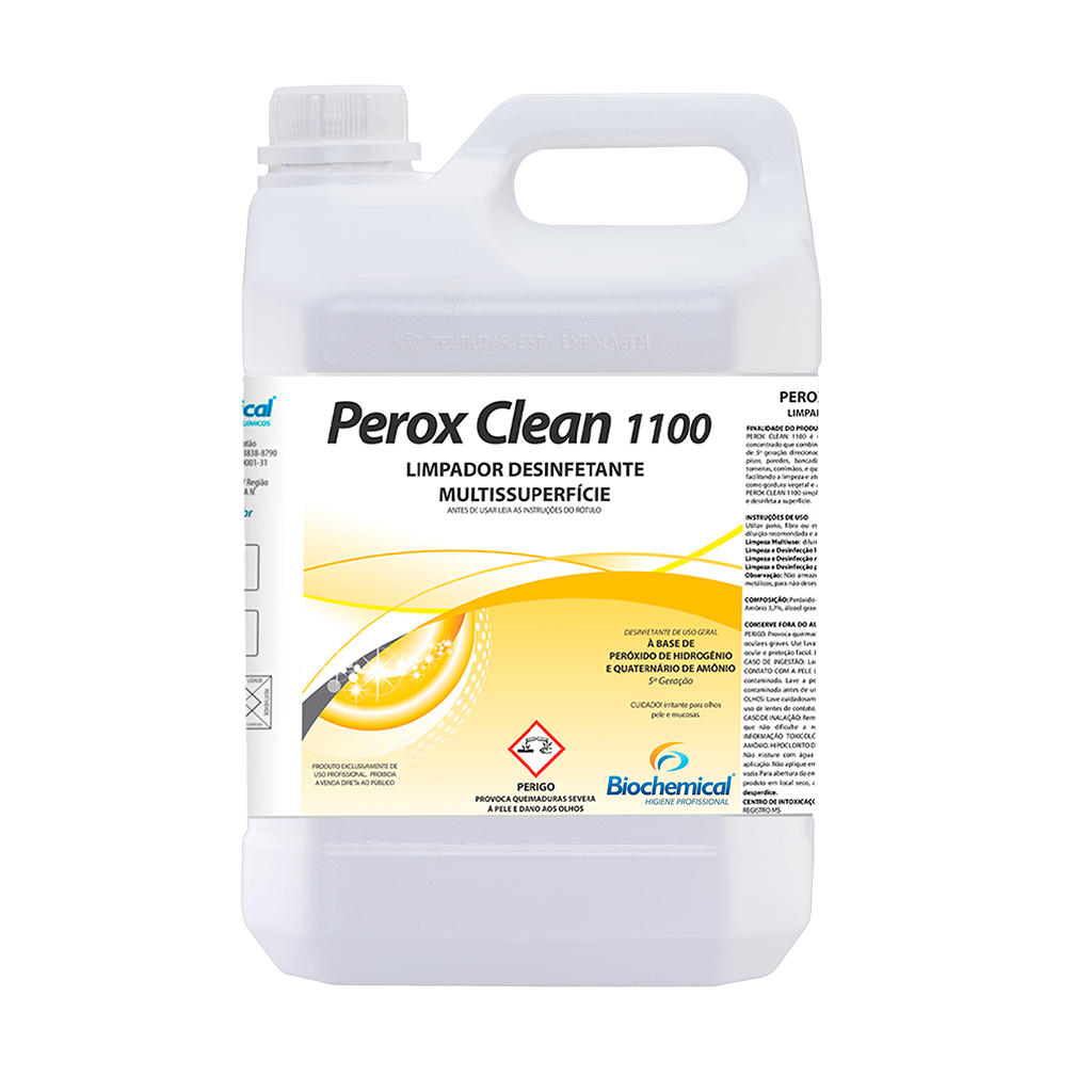 PEROX CLEAN 1100 Limpador com ação desinfetante à base de Peróxi-do de Hidrogênio associado a Quaternário de Amô-nio de 5ª geração para uso geral. Diluição – até 1:100 Categorias: Limpeza em Geral, Sanitários e Higienização Produtos relacionados SMELL PREVENT HC BIOCARPT ARBIO PREMIUM