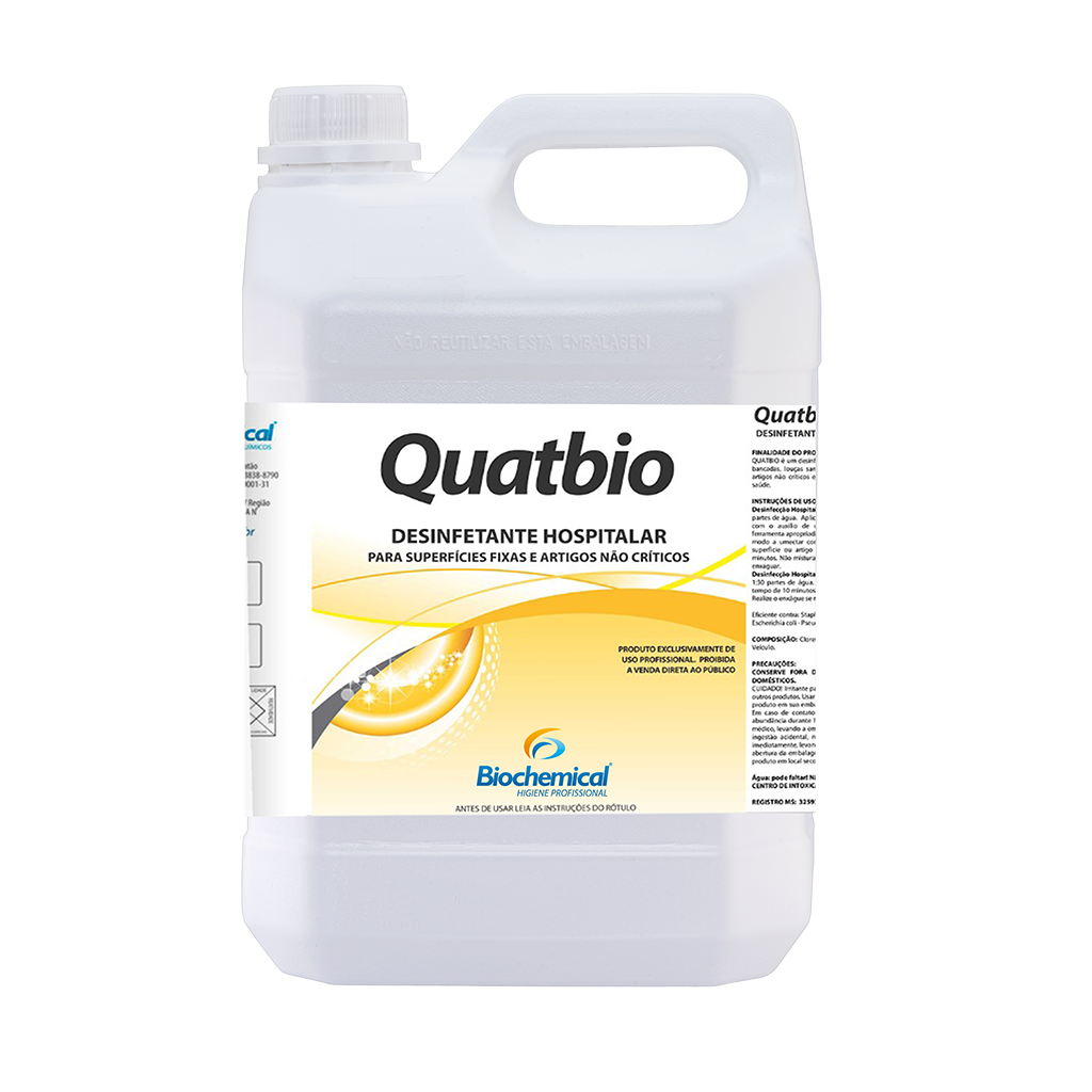 Desinfetante e sanitizante à base de Quaternário de Amônio de 5ª geração. Produto desenvolvido para o uso hospitalar in-cluindo áreas críticas. Quatbio tem ação bactericida e bacteriostática, agindo com eficácia sobre as bactérias gram–positivas e gram-negativas. Possui laudos que comprovam sua ação de desinfecção contra as bactérias: Staphylococcus aureus, Salmonella choleraesuis, Pseudomonas aeruginosa e Kleb-siella Pneumoniae Carbapenemase (KPC). Diluição – até 1:30