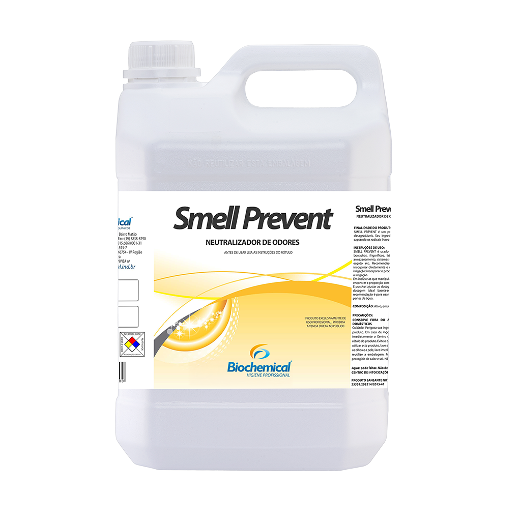 Da mesma família do SMELL PREVENT HC, o SMELL PREVENT foi desenvolvido pensando nos problemas de odores desagradáveis para utiliza ção institucional, oferecendo diluição que propõe um custo final muito baixo, além de ser diferen te de tudo que já conhecemos no mercado. Seu ingrediente ativo atua como filtro molecular, cap tando os radicais livres que proporcionam os maus odores, inclusive contra o tabaco.